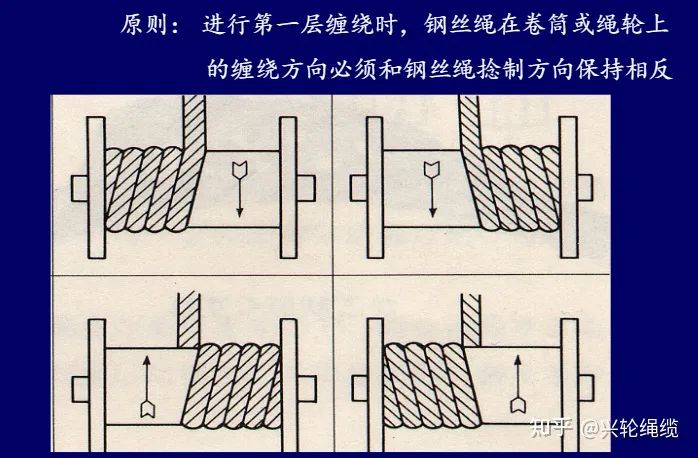 钢丝绳在卷筒上缠绕方向,必须是使钢丝绳紧捻而不是松捻的方向缠绕。右旋绳槽的卷筒推荐使用左捻钢丝绳,反之,左旋绳槽的卷筒应使用右捻钢丝绳。
