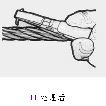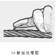 当钢丝绳出现断丝仍需进行使用时,应将断丝及时处理(见图10和图11)。可以用钢丝钳夹住断丝头部,前后反复弯折至钢丝断掉。经过这样处理,钢丝断头将被夹紧在股绳之间,不会对钢丝绳使用造成危害。当一个捻距内断丝数量达到外层钢丝总数10%时,钢丝绳必须更换。