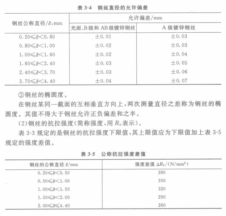 用精度为0.01mm的千分尺,在钢丝的同一截面内互相垂直的方向上两次测量所得直径的算术平均值,即为钢丝的实际直径。其允许偏差应符合表3-4的规定。