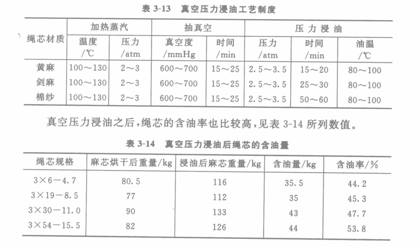 压力浸油和真空干燥一般是同时进行的。这种方式就称为真空压力浸油。其工艺制度见表3-13。