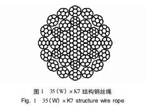 随着国家“一带一路”政策深入推进,配套工程机械用钢丝绳迎来新的机遇和挑战,特别是随着进口工程机械以及国内起重机械大型化的发展,要求钢丝绳应具有高破断拉力,促进了高强度、高破断、高耐磨、抗旋转多层压实股钢丝绳需求持续增加。本公司多次接到国内大型起重机械主机单位批量钢丝绳订单,要求钢丝绳直径35.5mm,最小破断拉力1050kN,微旋转、耐磨性好。查阅标准GB/T 20118、GB8918,相同直径范围产品均无法满足客户最小破断拉力要求0-1,对比YB/T5359一2010标准力学性能表发现相同结构面接触产品较普通结构整绳破断拉力高12%0,符合客户高破断拉力要求,而35(W)×7是典型的抗旋转结构钢丝绳,基于以上分析最终选定面接触35(W)xK7结构钢丝绳,公称抗拉强度1960MPa,35(W)×K7结构钢丝绳如图1所示。