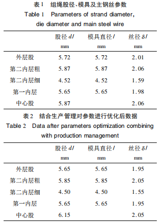 经过设计计算,组绳股径、模具及主钢丝直径见表1,对参数进行优化后的数据见表2。