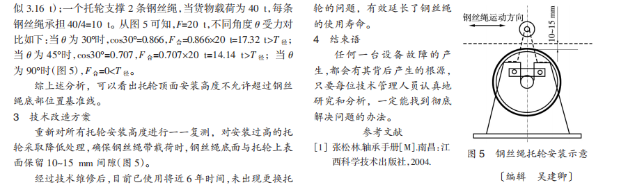 钢丝绳托轮作用是钢丝绳在自身重力作用下发生下垂时支撑住钢丝绳来回运动,确保不与臂架结构件表面直接产生刚性摩擦。如果钢丝绳托轮安装出问题,轻则门机无法正常使用,重则会造成钢丝绳加剧磨损,最终导致钢丝绳发生断裂,引发生产安全事故。海南八所港务有限责任公司于2008年购置2台MQ2533门座式起重机,在使用过程中发现起升钢丝绳托轮经常损坏,主要表现在托轮被磨穿断裂,维修更换频率比较高,钢丝绳使用寿命也比其他门机要短的多。针对这一问题,组织相关技术人员进行深入研究和分析,发现托轮磨穿及钢丝绳使用寿命短的主要原因是维修人员在安装托轮时安装过高,造成钢丝绳来回运动时托轮受到钢丝绳频繁摩擦和挤压,加速托轮磨损而发生断裂,同时也加剧钢丝绳的磨损,通过技术改造后,托轮磨穿问题得到彻底解决,连续使用6年时间,未再发生托轮被磨穿断裂问题,同时延长钢丝绳使用寿命。