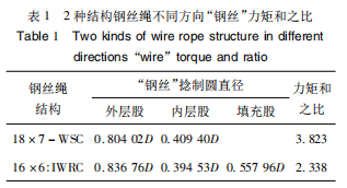 为了便于计算,捻距取无穷大,钢丝绳直径为D,2种钢丝绳产生力矩与内层绳产生力矩之比计算结果见表1。