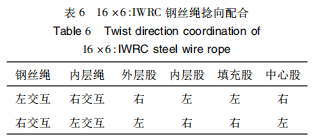 多股钢丝绳抗旋转性与各股和各层绳的捻向有着重要关系园,为了保证钢丝绳具有最好的抗旋转性,各股的捻向设计见表6。