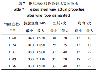 钢丝绳拆股试验结果表明,钢丝绳捻制后钢丝的力学性能均满足GB8918-2006的要求,拆股检测结果见表7。
