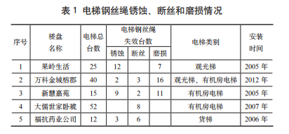 果岭生活的电梯是观光梯,钢丝绳直径为10mm,使用年限10年,由于房子朝向问题,电梯长期受太阳暴晒,绳芯润滑油已挥发,井道内的钢丝绳表面干燥,生锈,在轿顶与井道内可见很多红褐色锈斑,目前电梯钢丝绳全部更换了。万科金域榕郡的电梯是观光梯和有机房电梯,钢丝绳直径为10mm和12mm两种规格,这个楼盘是新楼盘、精装修楼盘,据维保人员介绍开发商为了赶工期,电梯在装修期间运送各种建筑材料,特别是装修垃圾,造成电梯钢丝绳全是油垢,油垢经电梯维保公司几次清洗,仍是无法彻底根治,就出现了油垢磨料对钢丝绳的磨损。新慧嘉苑的电梯是有机房电梯,使用年限10年,钢丝绳直径为13mm,这个小区的电梯钢丝绳出现两种情况,一种是钢丝绳非常干燥,一种是都是油垢,钢丝绳锈蚀磨损严重。维保和业主反映说钢丝绳质量有问题,在检验过程中发现锈蚀的钢丝绳大部分为点蚀,钢丝绳表面黑斑很多,油垢的钢丝绳似乎是有过量的油从绳芯往向流。大儒世家卧琥的电梯是有机房电梯,钢丝绳直径为8mm,在定期检验过程中发现钢丝绳断丝问题比较突出,个别出现过断股,依据业主和维保公司的反映认为钢丝绳质地偏软,属于疲劳破坏。福抗药业公司的货梯,使用10年,钢丝绳直径为13mm,受药厂的腐蚀气体影响,钢丝绳出现严重锈蚀、断丝和磨损三种情况。