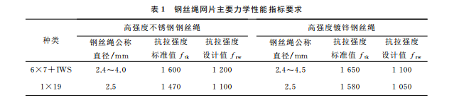 1)钢丝绳网片:选用高强度镀锌钢丝绳,主要材质为优质碳素结构钢制丝(S和P含量≤0.03%),编制结构型式为6×7+IWS金属股芯右交互捻不锈钢丝绳,公称直径3.05mm,其特点是高强度、低松弛、高延性;钢丝绳镀锌材料质量和锌层重量应符合GB/T15393《钢丝镀锌层》中AB级的规定,主要力学性能指标应满足表1要求。