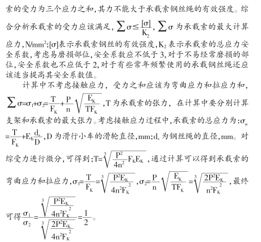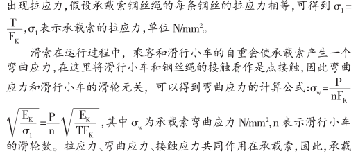 滑索在运行中,钢丝绝受力不同,承载索受到3个作用力,其分别为接触应力、弯曲应力、拉应力。3个作用力中,弯曲应力对承载索的磨损影响十分大,但对承载索的强度影响极小,国此,在进行滑索的承花索的选行计算分祈时,是把拉应力作为强度条件,把弯曲应力作为承截索耐房强度的验算分析条件。弯由应力对于承载索也是十分重要,但是其计算十分困难,目前基本是结果理论知识进行救断的,在实际中,一般都是用实际经验和理论知识站合分析的,由于张力作用,承载索上会