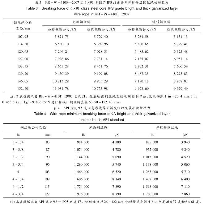 RR-W-410D-88]、RR-W-410E一2002]、RR-W-410F-2007给出相同结构类别、级别、公称直径的厚镀锌钢丝绳,其公称破断拉力(注:即最小破断拉力)与光面钢丝绳和薄镀锌层钢丝绳不同,前者相对后二者有明显的降低。部分数据见表1、表2、表3(注:对比不同时期标准,相关参数继续保持该规律)。ANSI/APl9A-2004日在表J.1类别一粗直径6股钢丝绳注中写道:“上述破断拉力值适用于光面或B类镀锌钢丝的钢丝绳。镀层质量比B级镀锌钢丝较重的钢丝绳的破断拉力可能比上述值略低”。ASTMA1023/A1023M-07明示:采用拉拔后再镀锌钢丝生产的钢丝绳(注:工艺分析其应为厚镀锌层钢丝绳),钢丝绳最小破断拉力降低幅度10%。API规范9A-1995日在其4.6.4中写道:“如表6到表15所示,先镀后拉钢丝绳规定的公称拉力与光面钢丝绳相同,而镀锌钢丝绳(注:工艺分析其应为厚镀锌层钢丝绳)是光面钢丝绳拉力的90%……”;在4.6.5写道:“由用镀锌到成品尺寸的钢丝制成的各个级别的钢丝绳的公称破断拉力是光面钢丝绳公称拉力的90%”。其给出部分规格光面与采用厚镀锌层钢丝制造锚缆钢丝绳最小破断拉力,见表4。BRDOND关于DIAMONDBLUE钢丝绳也有A类镀锌(注:即厚镀锌)钢丝绳相对Z类(注:工艺分析等同B类)镀锌钢丝绳,其最小破断拉力减小约2%的说明。REDAELLI在其产品样本资料中关于镀层影响钢丝绳最小破断拉力体现更明显。
