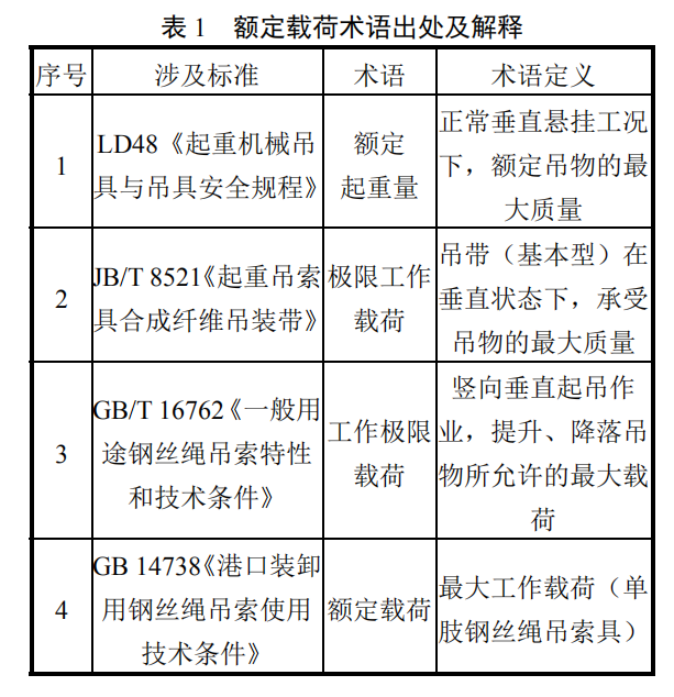 两倍额定载荷的拉力试验是国家标准要求中的出厂检验项目,是任何生产制造厂强制要求执行的常规检验项目。吊索具进行该试验后,应依然可以正常使用。额定载荷术语的定义多种多样,如表1所示。