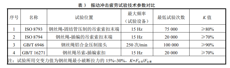 2.2.2振动冲击疲劳试验吊索具申请船级社型式认可,其中强制要求吊索具产品进行振动冲击疲劳试验。参考标准为GB/T16271和GB/T6946,试验的宗旨在于评价吊索具产品在受到振动冲击、周期性循环受力状态下的疲劳性能,以此确保其在限定工况下的安全稳定性。其中难点在于,钢丝绳吊索具的结构型式不同,在国内标准和国际标准中,其振动冲击疲劳试验技术参数有所区别,现对其进行对比,如表3所示。