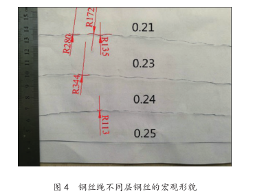 mm钢丝比钢丝绳最外层p0.21mm钢丝晚出现断丝,但均比40.21mm钢丝先达到100%的断丝率。值得关注的是,钢丝绳外绕股的中心钢丝(④0.23mm仅在钢丝绳接近极限状态时,才开始有断裂的钢丝产生,0.23mm钢丝基本都是随着整绳断裂而断裂。根据实验推断,