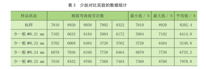 为了进一步研究钢丝绳中不同层钢丝对钢丝绳弯曲疲劳性能的影响,安排了同种结构钢丝绳的缺丝对比实验,实验数据如表3中所示。从表3中数据可明显看出,在缺少一根④0.23mm单丝时,钢丝绳的极限疲劳次数下降的幅度最大,由此可见,与钢丝绳中其它位置的钢丝相比,外套股中心钢丝的有无对钢丝绳整体的弯曲疲劳寿命影响最大。
