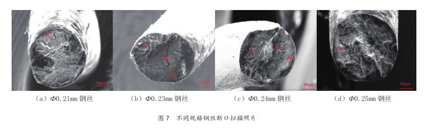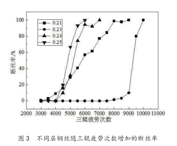 mm和(50.21mm的都大。0.25mm钢丝虽然不具有波形,但作为钢丝绳绳芯的组成单元,在钢丝绳受轴向拉应力时,绳芯钢丝产生的应力最大,使得绳芯处钢丝的疲劳寿命值低:其次,相同规格的帘线成品,钢丝的丝径越祖,其抗疲劳性能越差",使得(0.25mm中心钢丝在钢丝绳弯曲疲劳过程中断裂速度过快。