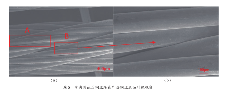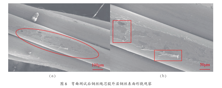 2.3钢丝表面形貌与断口观察图5是钢丝绳最外层钢丝的表面形貌图。从图5a图可以看出经过弯曲测试后钢丝绳最外层钢丝(40.21