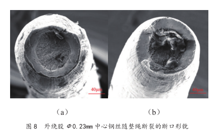 如图8是外绕股40.23mm中心钢丝随整绳断裂后的断口形貌,从图中可以看出④0.23mm钢丝断口中存在明显的颈缩现象,钢丝被拉断。但是与常规的钢丝颈缩断口形貌相比,又有着不同之处。40.23mm钢丝断口中芯部有明显的二次裂纹,而常规钢丝颈缩断口芯部会形成细小的韧窝。分析认为,0.23mm钢丝在钢丝绳弯曲疲劳过程中形成了疲劳损伤,从而使钢丝在较大载荷的情况下,形成芯部具有二次裂纹而不是韧窝的颈缩形貌。