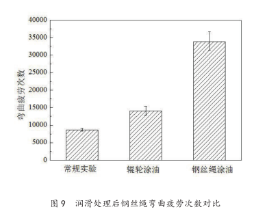 为了研究摩擦磨损对钢丝绳弯曲过程中影响因素的大小,安排了涂油润滑后的钢丝绳弯曲疲劳实验。图9是涂油润滑后钢丝绳弯曲疲劳次数的对比图,结果表明,仅对疲劳机辊轮的轮槽内表面进行润滑处理时,钢丝绳的极限弯曲疲劳次数提升至原来的1.5倍左右;而直接对钢丝绳弯曲工作段进行全面润滑处理时,钢丝绳的极限弯曲疲劳次数提升至原来的4倍左右。